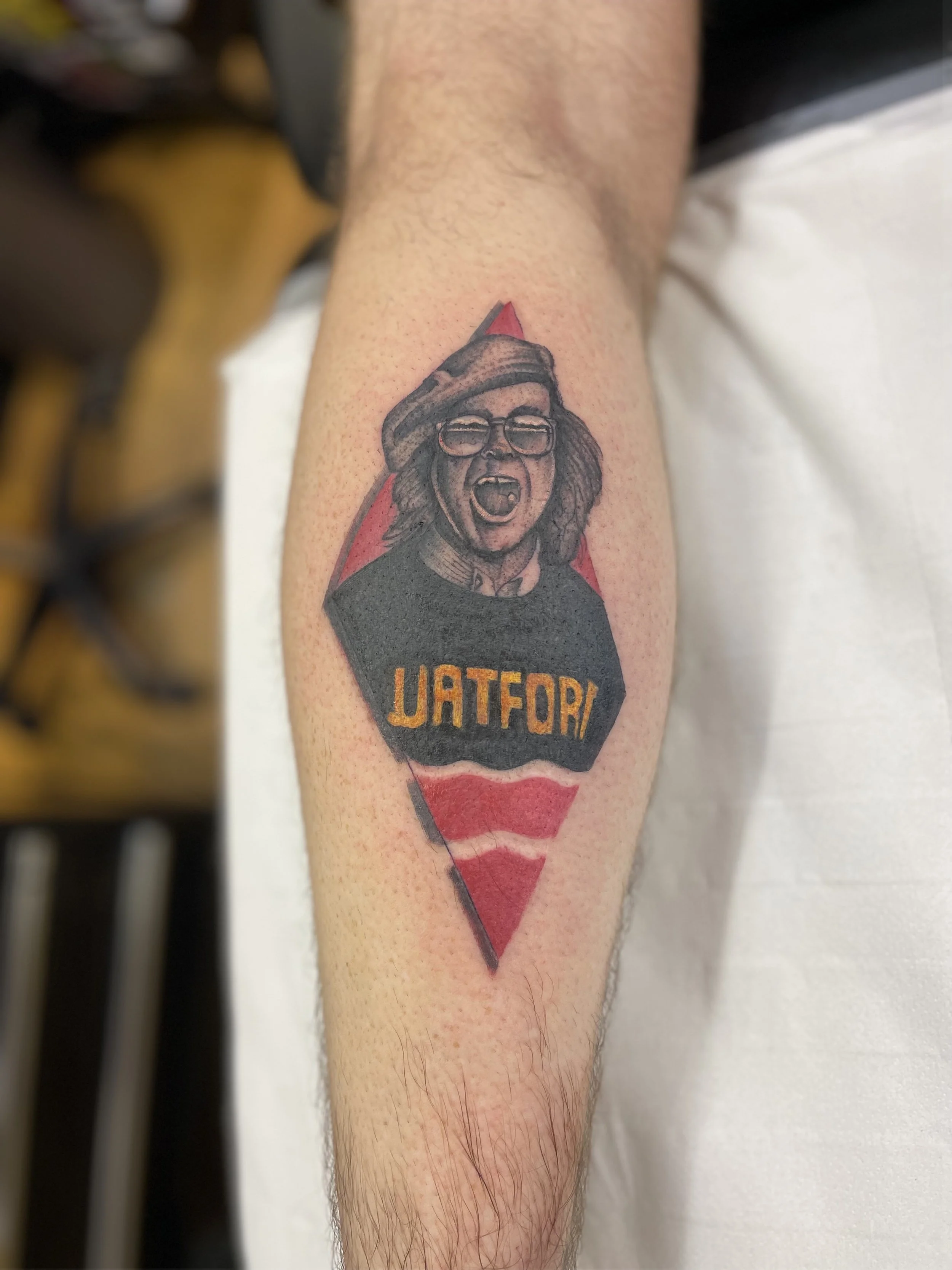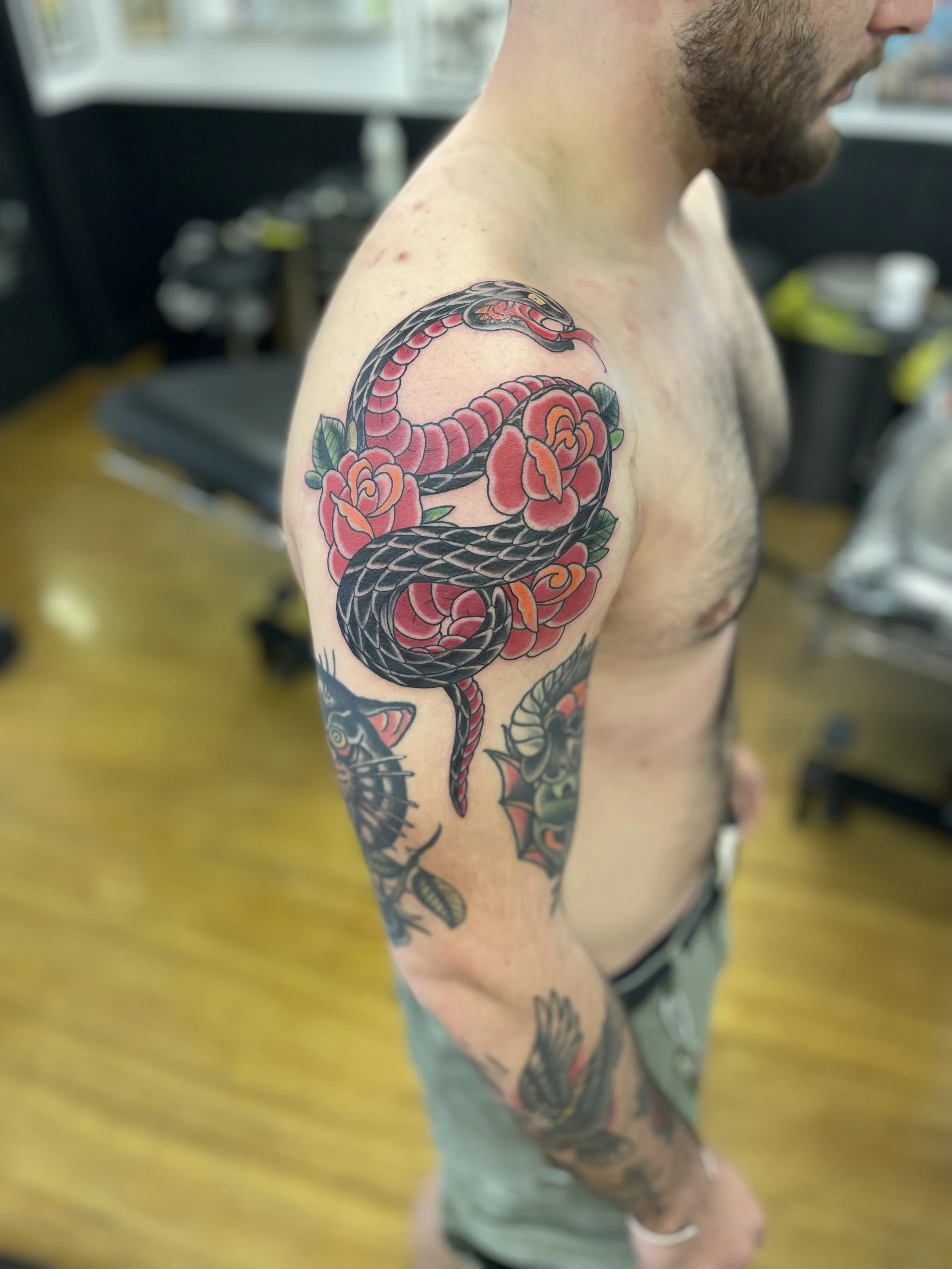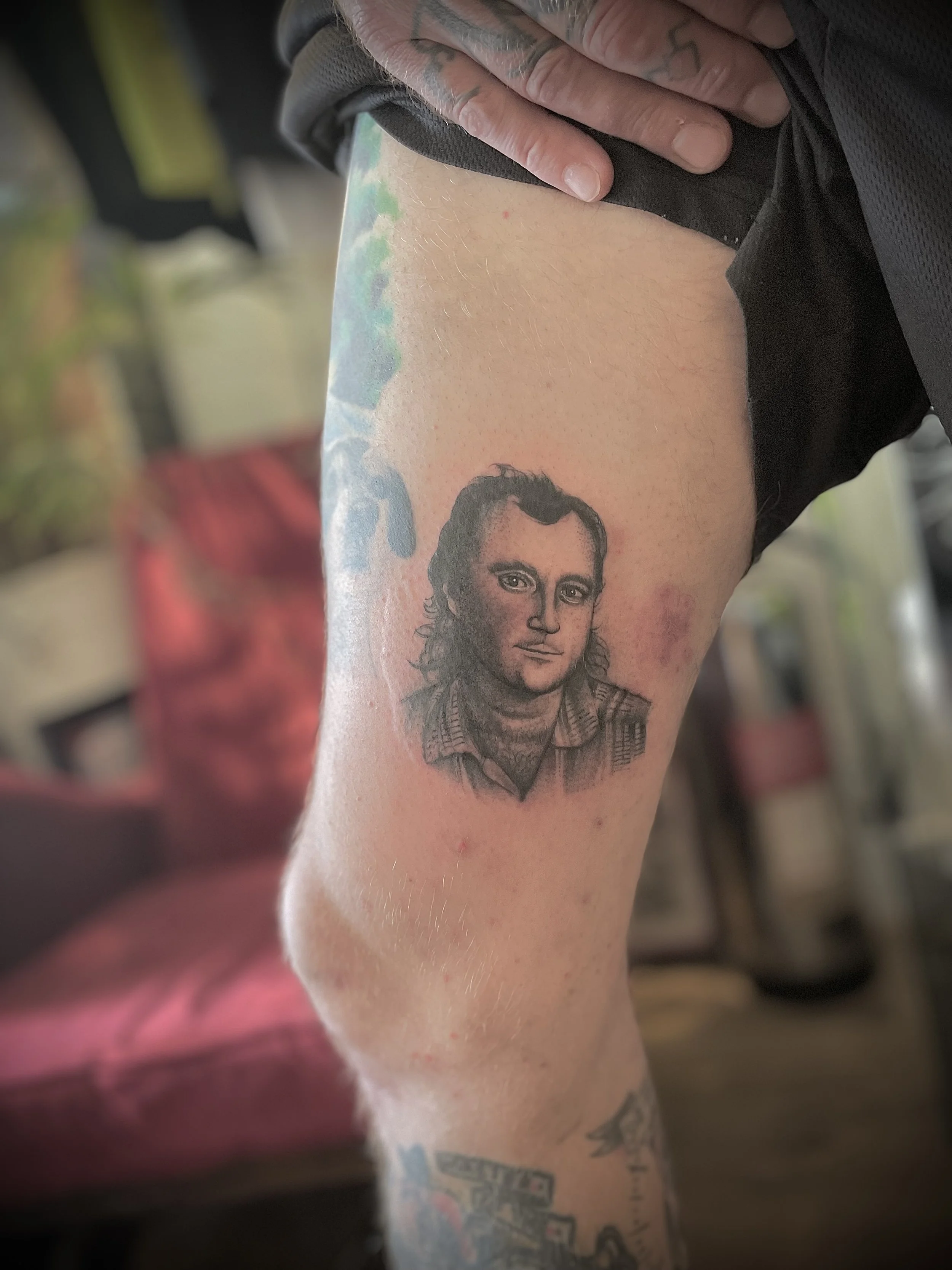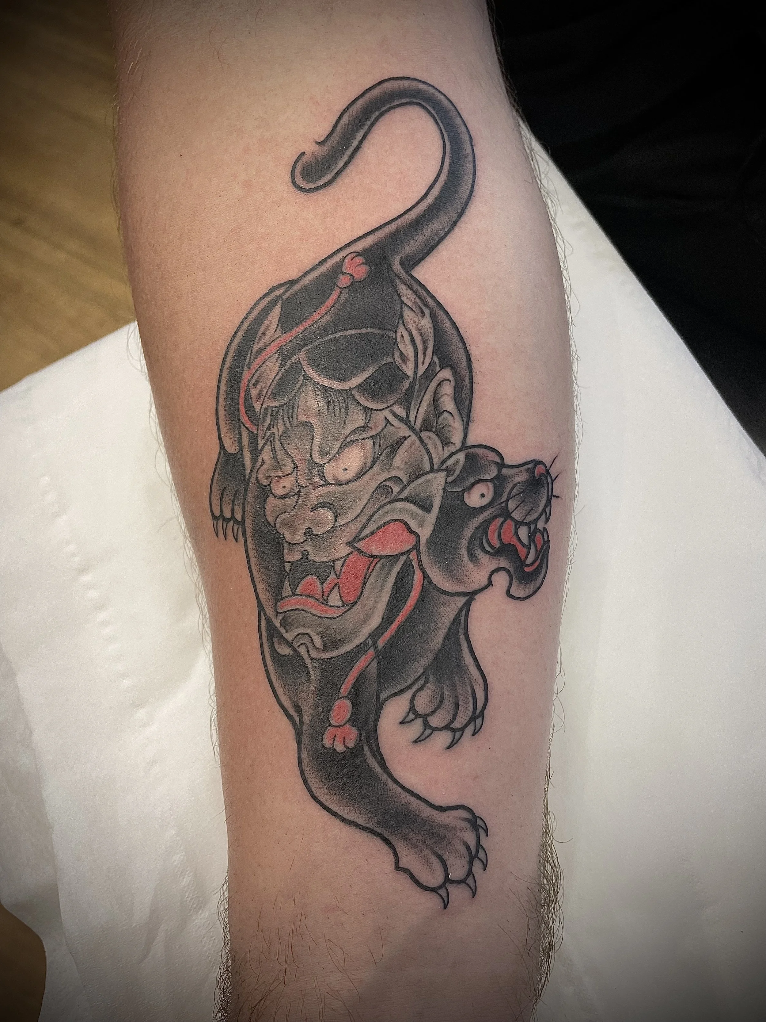 His favourite styles to tattoo are traditional and Japanese, done in his trademark bold colourful style, as well as specialising in black and grey portraits, and custom lettering. His work also takes influence from his love of wrestling, punk rock, and comic art as well as more traditional tattoo sources. Keeping up a love and respect for the traditional roots of tattooing, he enjoys painting water colour tattoo flash, and is also a skilled sign writer, hand painting lettering on anything from leather jackets to shop windows.