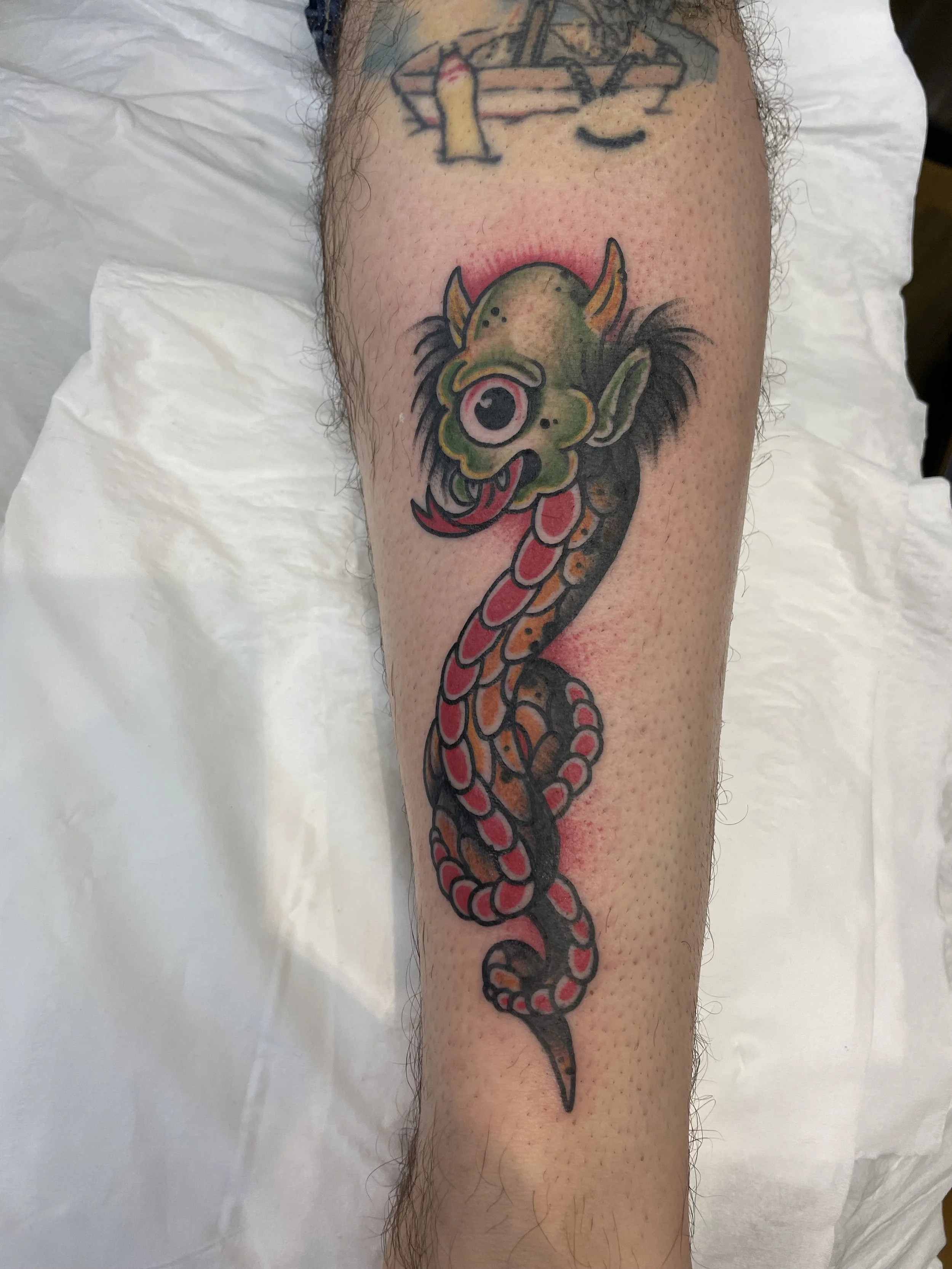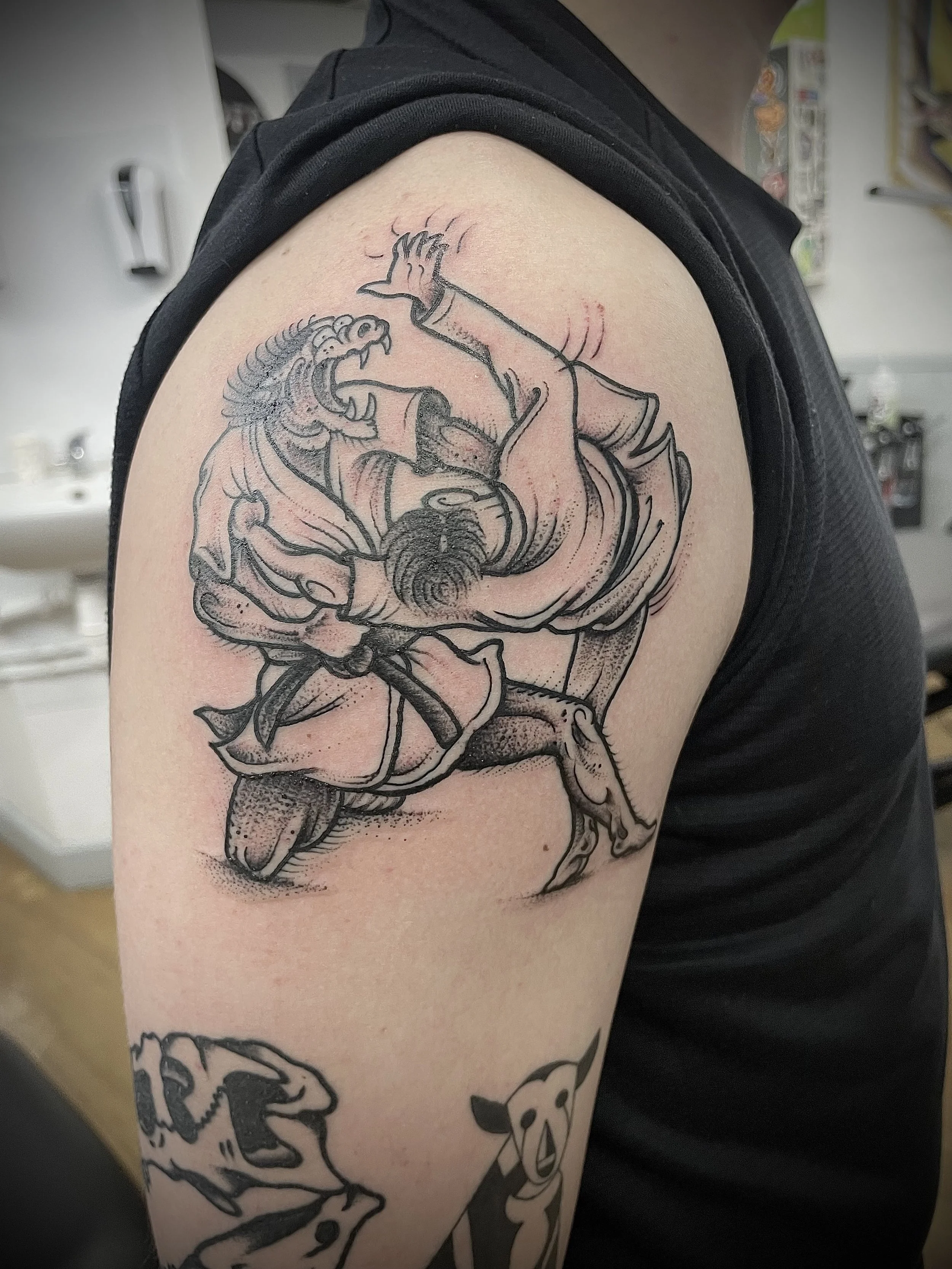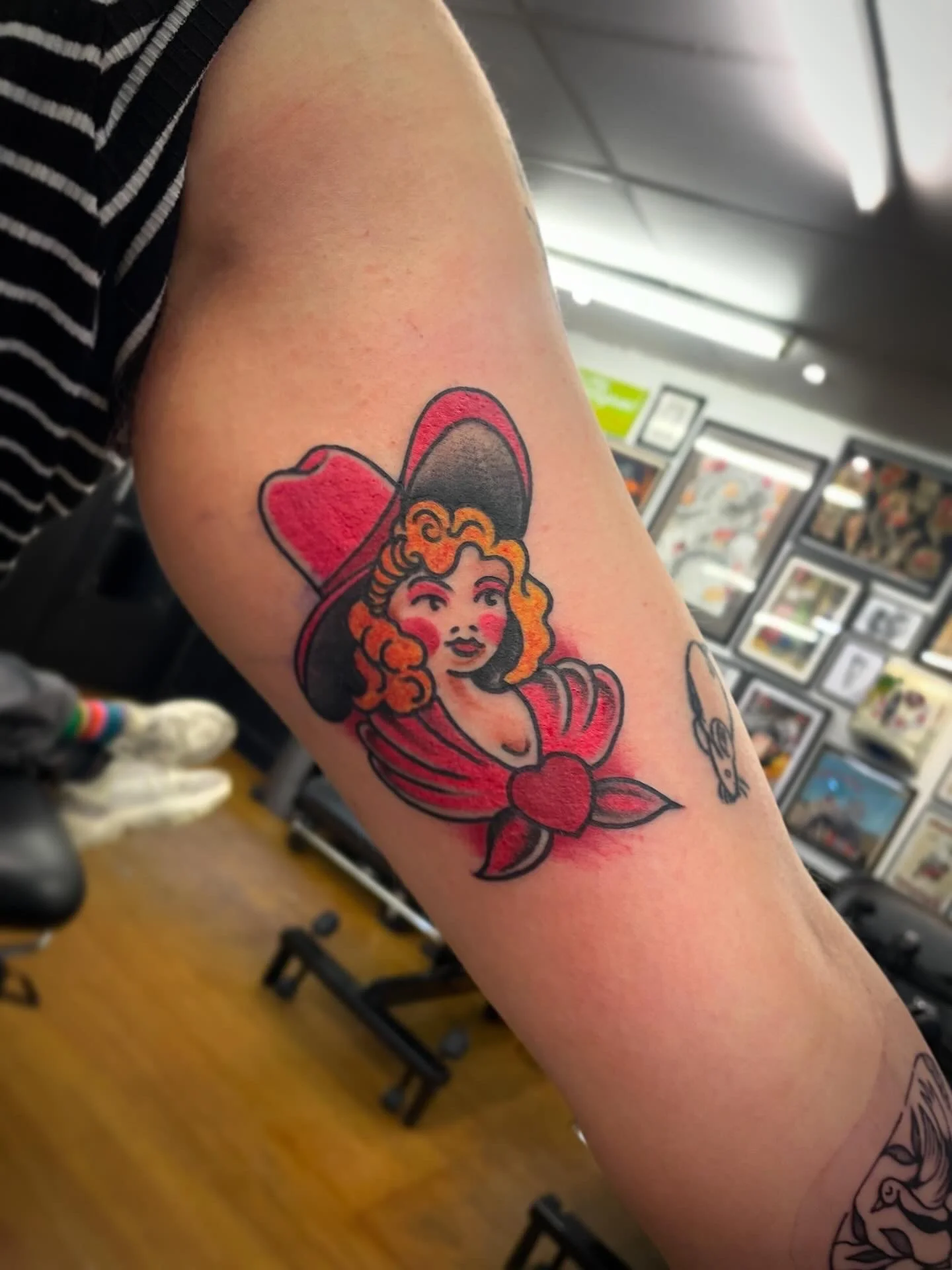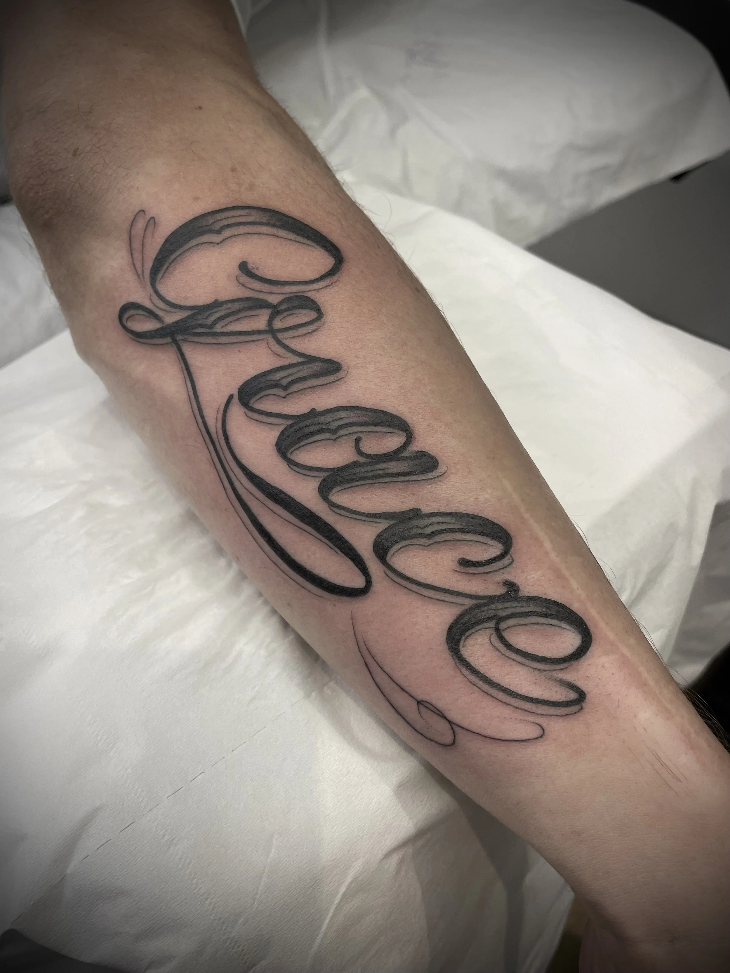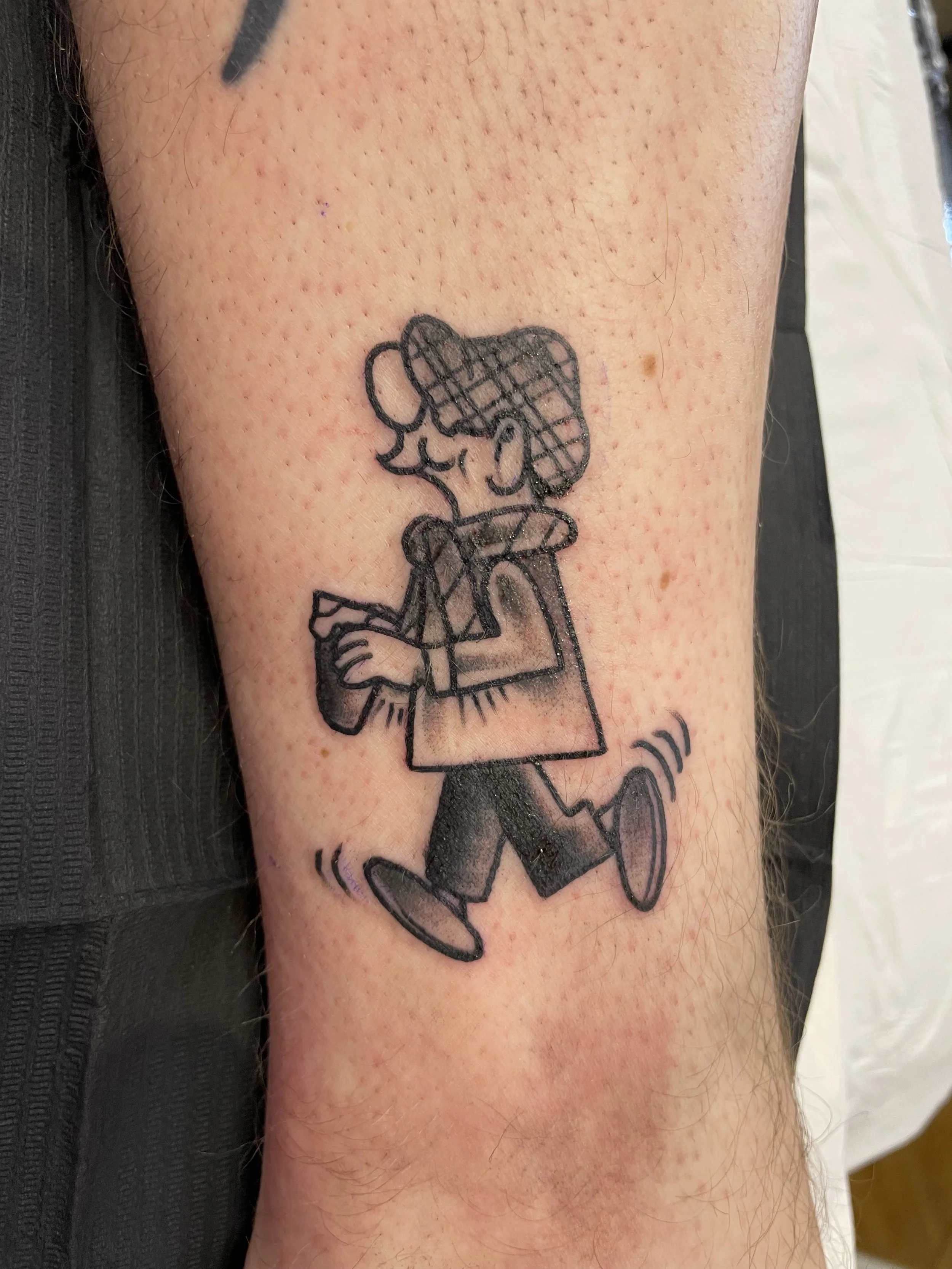 His favourite styles to tattoo are traditional and Japanese, done in his trademark bold colourful style, as well as specialising in black and grey portraits, and custom lettering. His work also takes influence from his love of wrestling, punk rock, and comic art as well as more traditional tattoo sources. Keeping up a love and respect for the traditional roots of tattooing, he enjoys painting water colour tattoo flash, and is also a skilled sign writer, hand painting lettering on anything from leather jackets to shop windows.