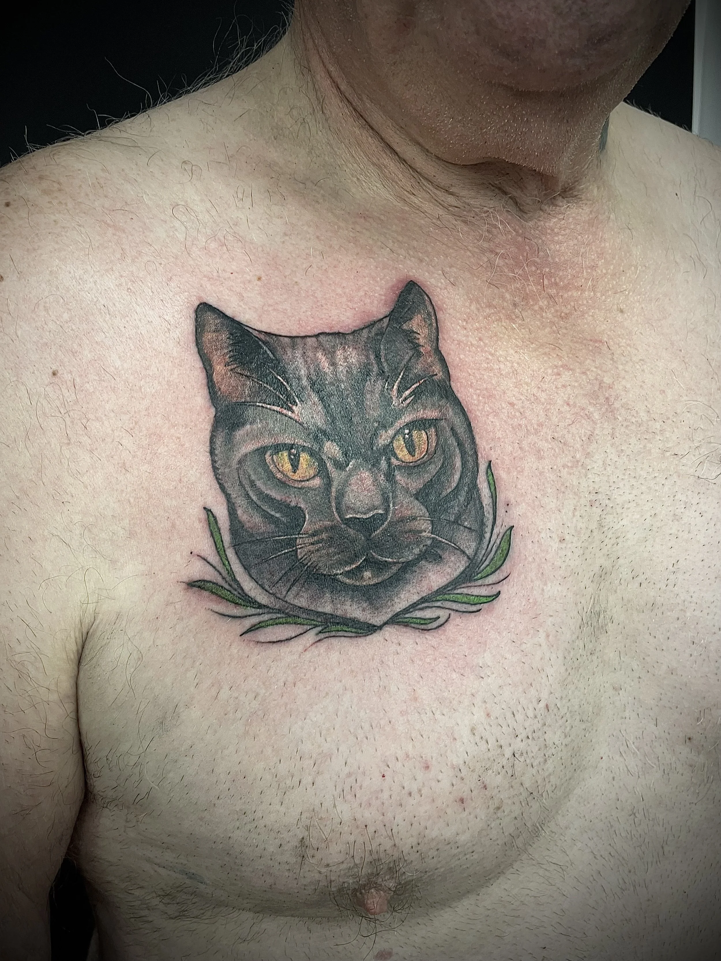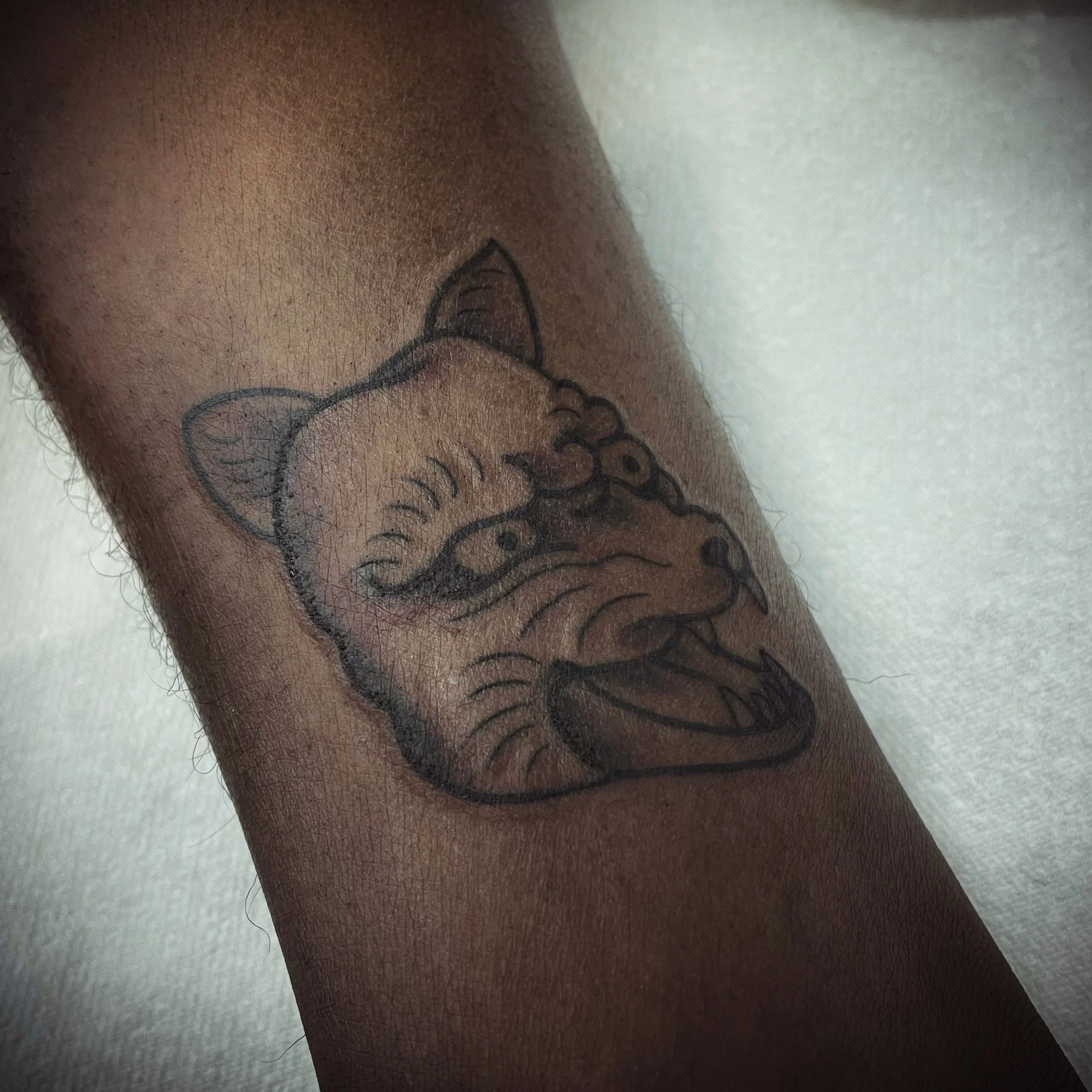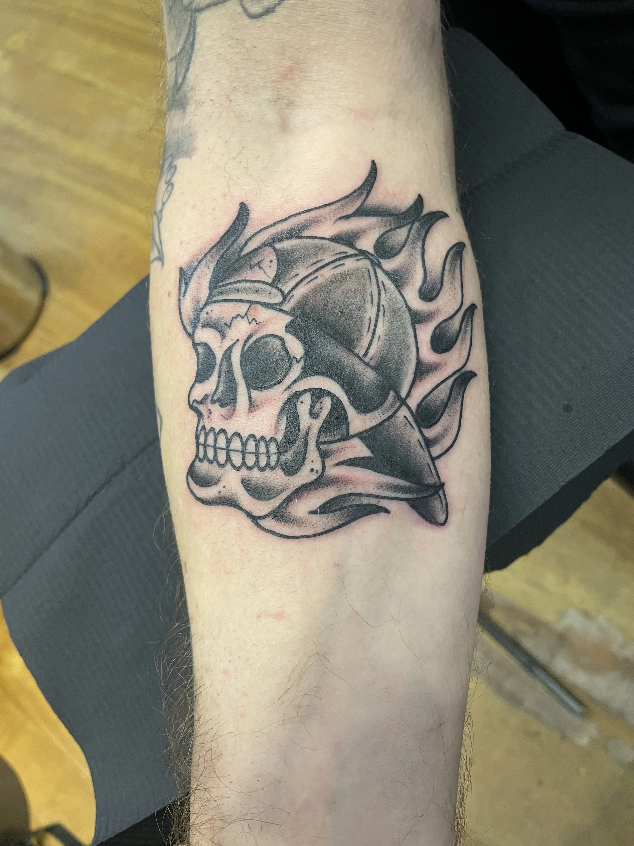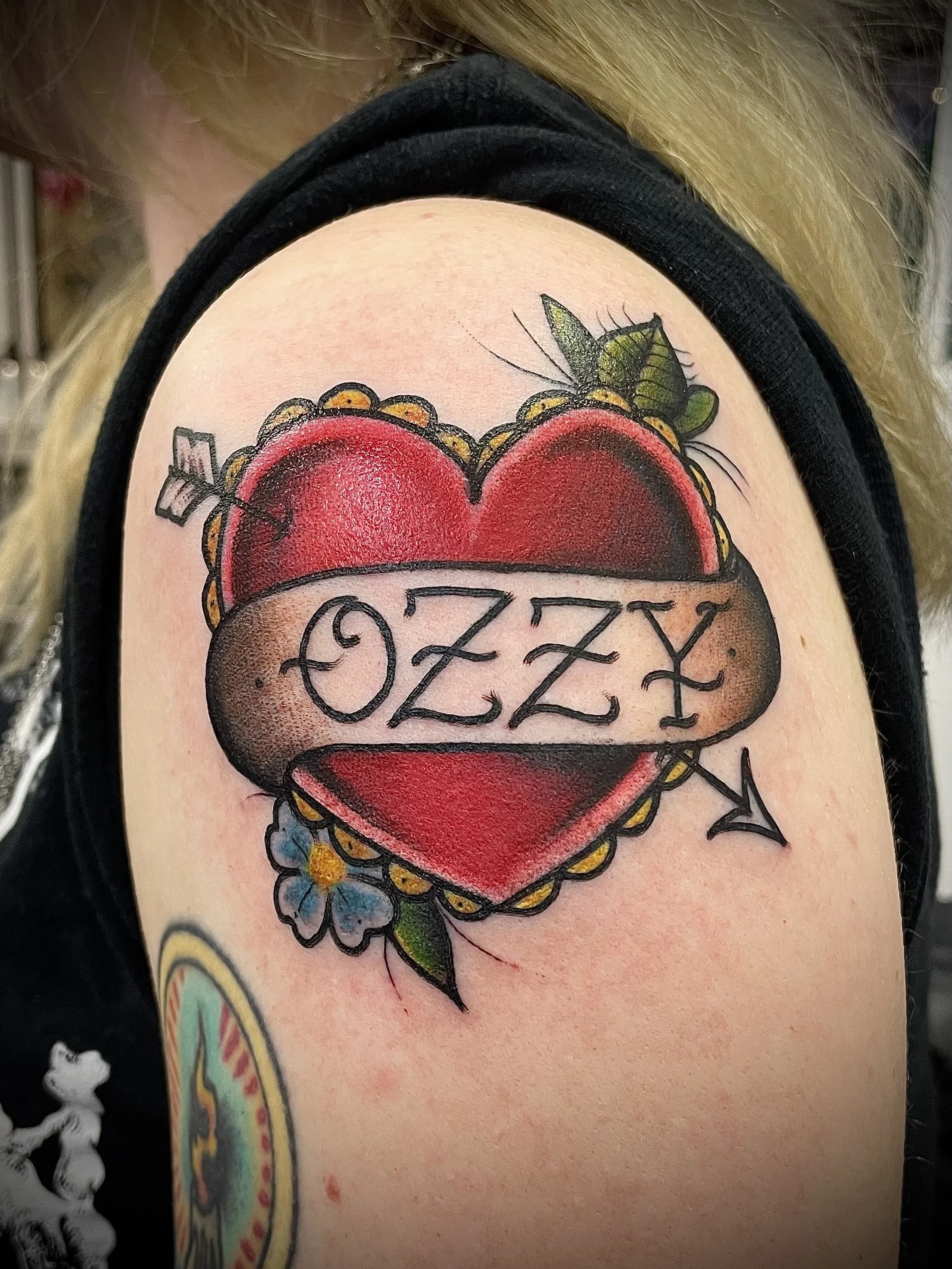 His favourite styles to tattoo are traditional and Japanese, done in his trademark bold colourful style, as well as specialising in black and grey portraits, and custom lettering. His work also takes influence from his love of wrestling, punk rock, and comic art as well as more traditional tattoo sources. Keeping up a love and respect for the traditional roots of tattooing, he enjoys painting water colour tattoo flash, and is also a skilled sign writer, hand painting lettering on anything from leather jackets to shop windows.