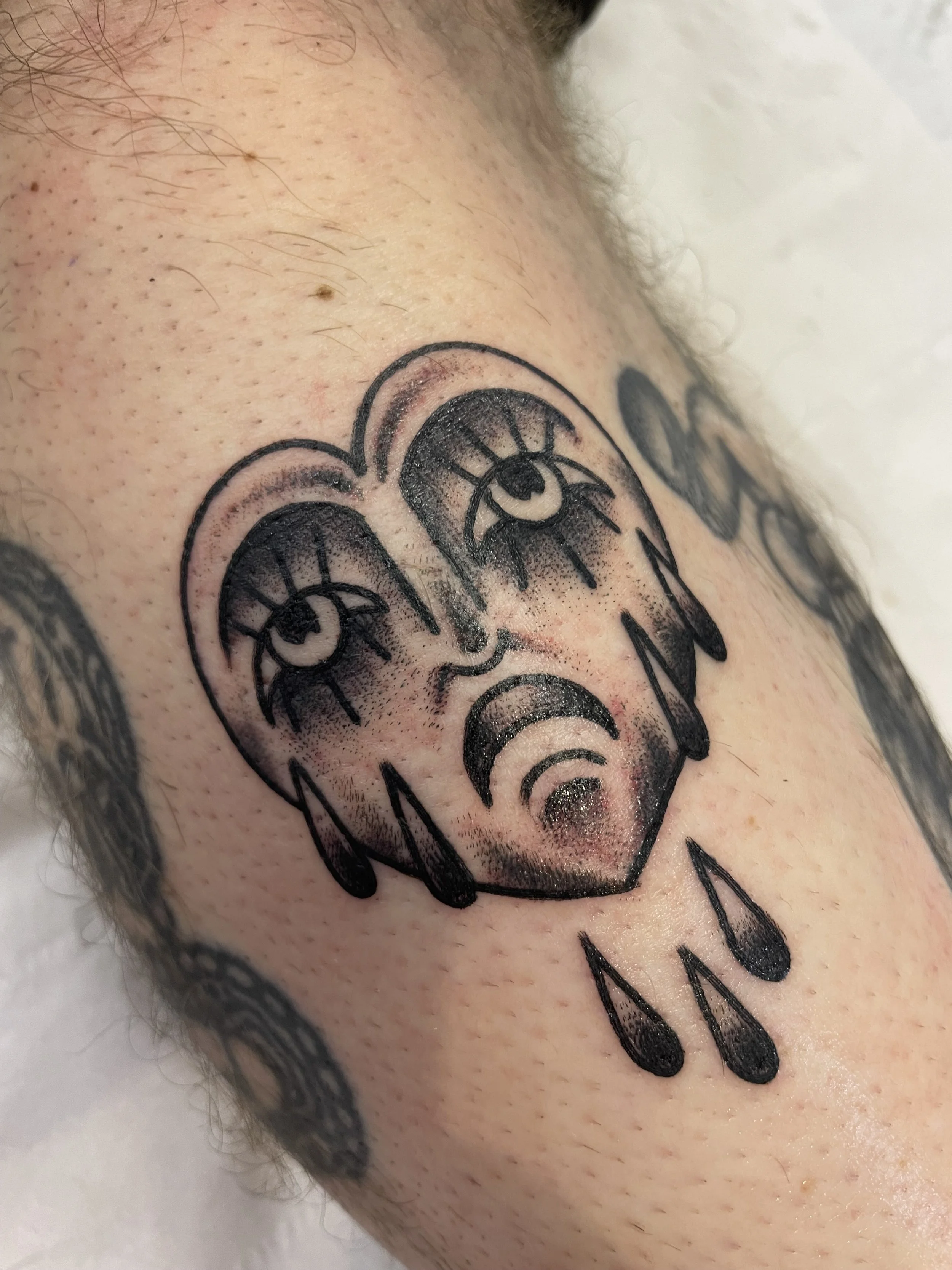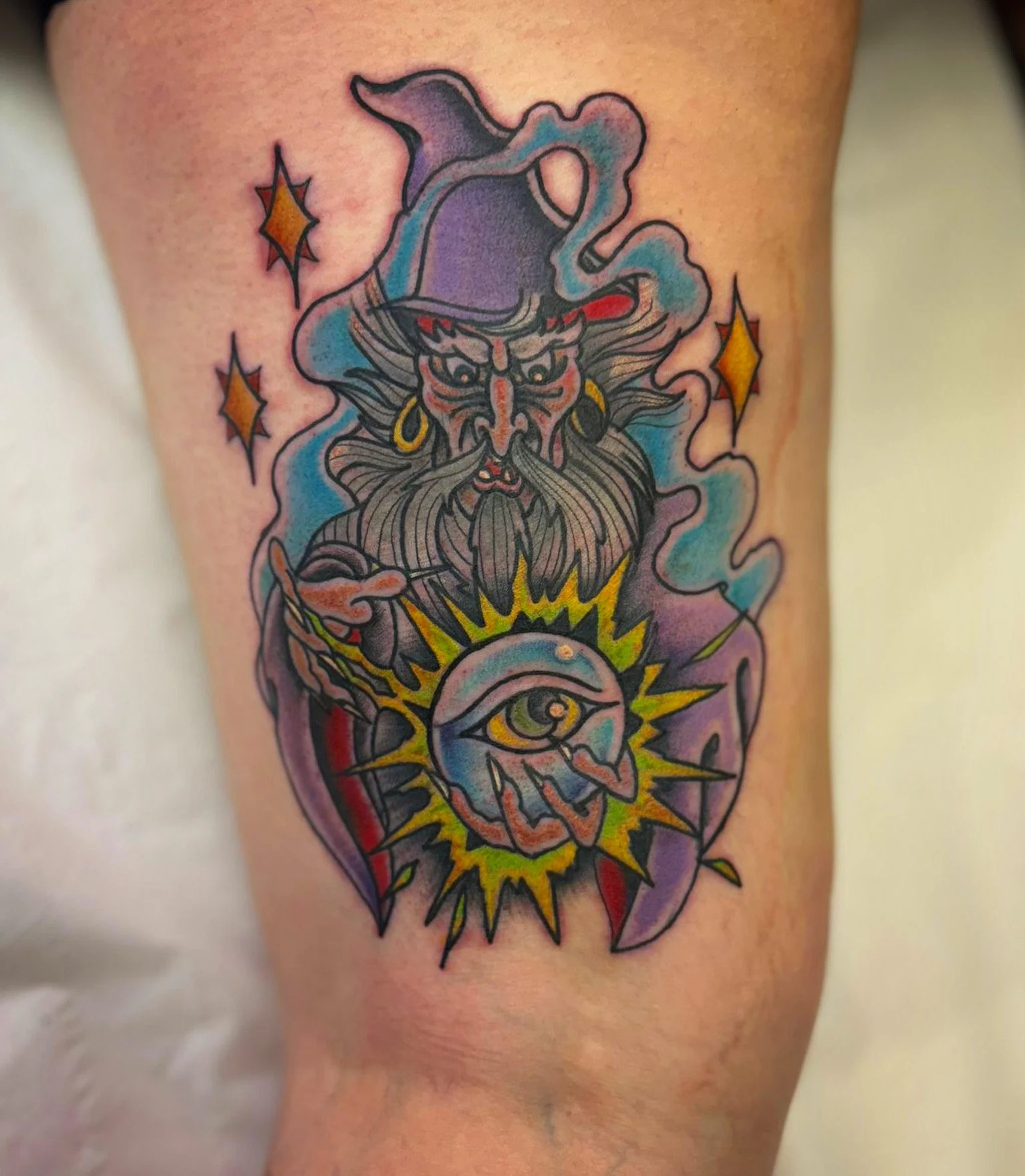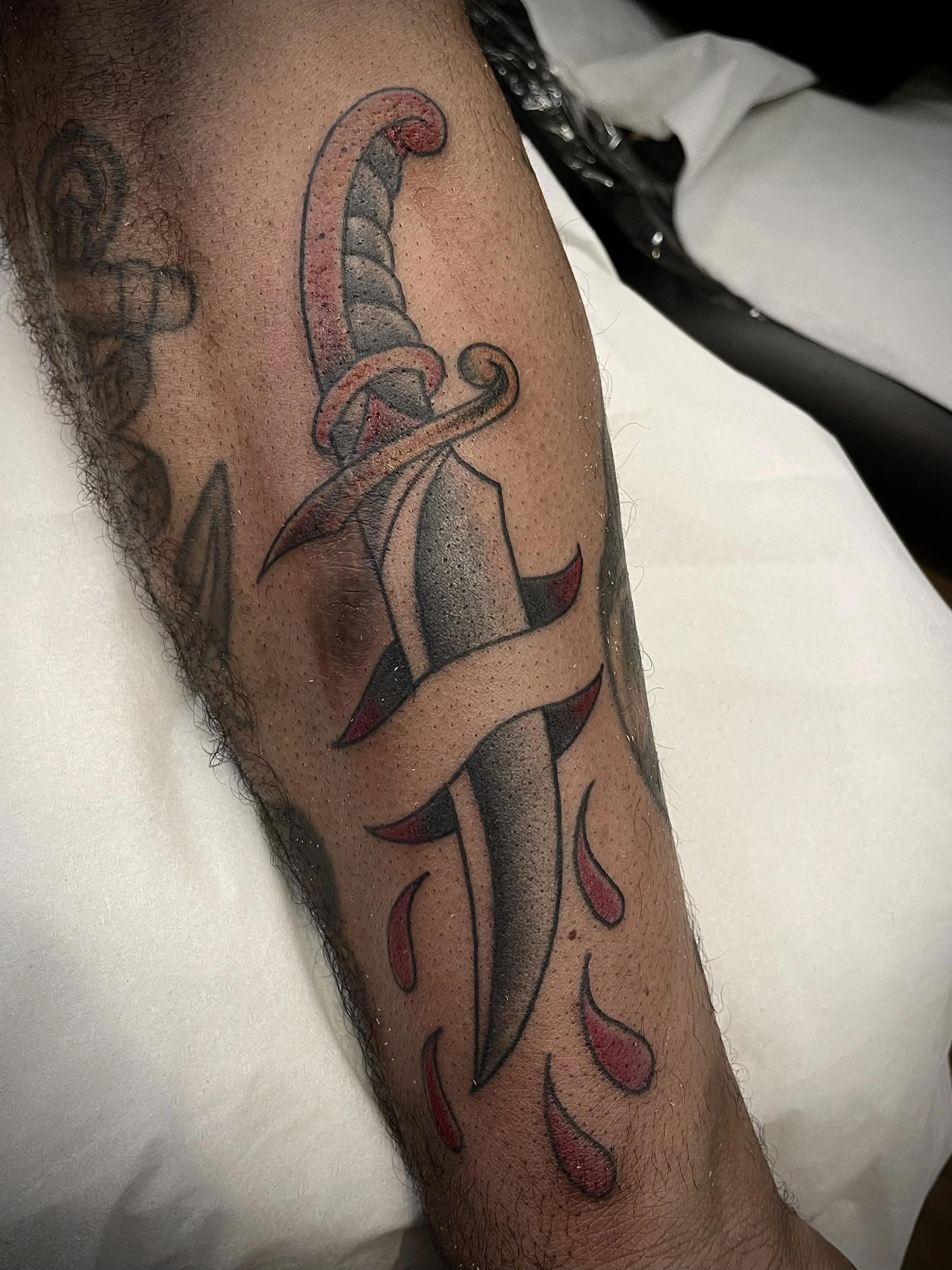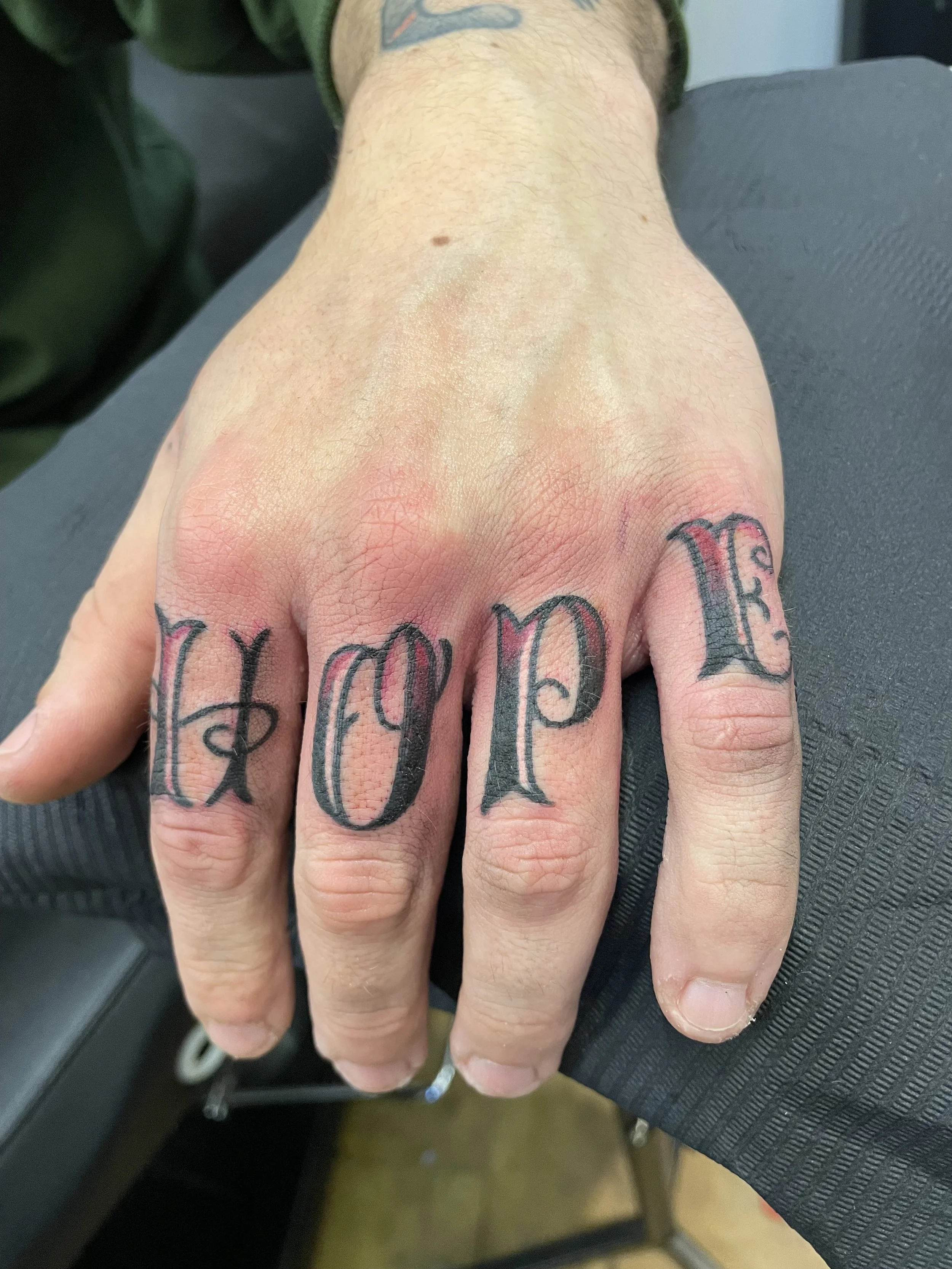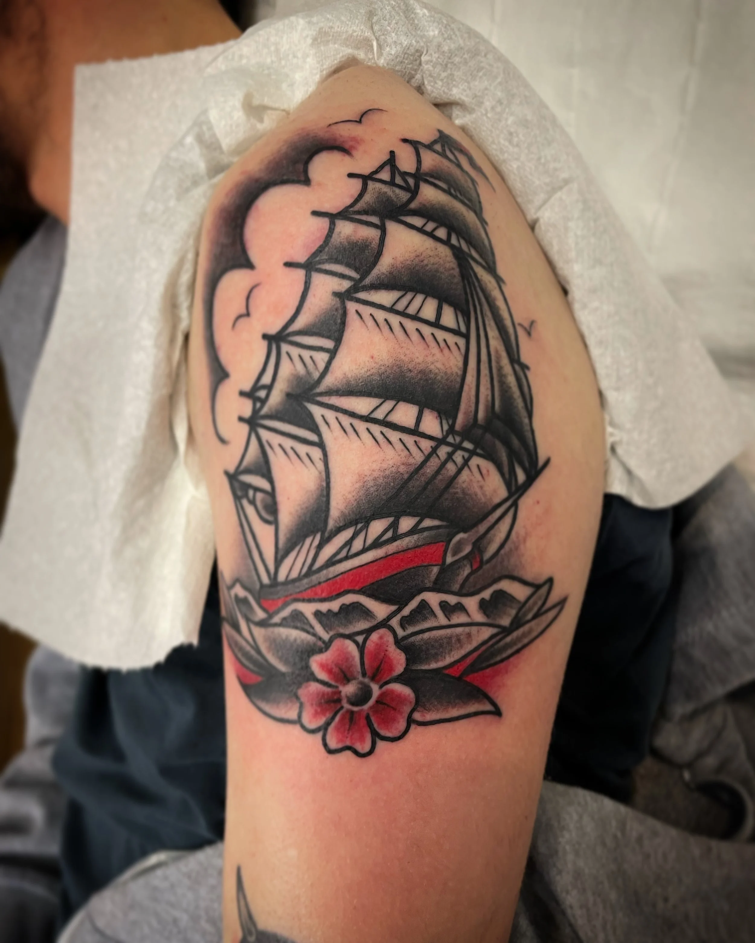 His favourite styles to tattoo are traditional and Japanese, done in his trademark bold colourful style, as well as specialising in black and grey portraits, and custom lettering. His work also takes influence from his love of wrestling, punk rock, and comic art as well as more traditional tattoo sources. Keeping up a love and respect for the traditional roots of tattooing, he enjoys painting water colour tattoo flash, and is also a skilled sign writer, hand painting lettering on anything from leather jackets to shop windows.