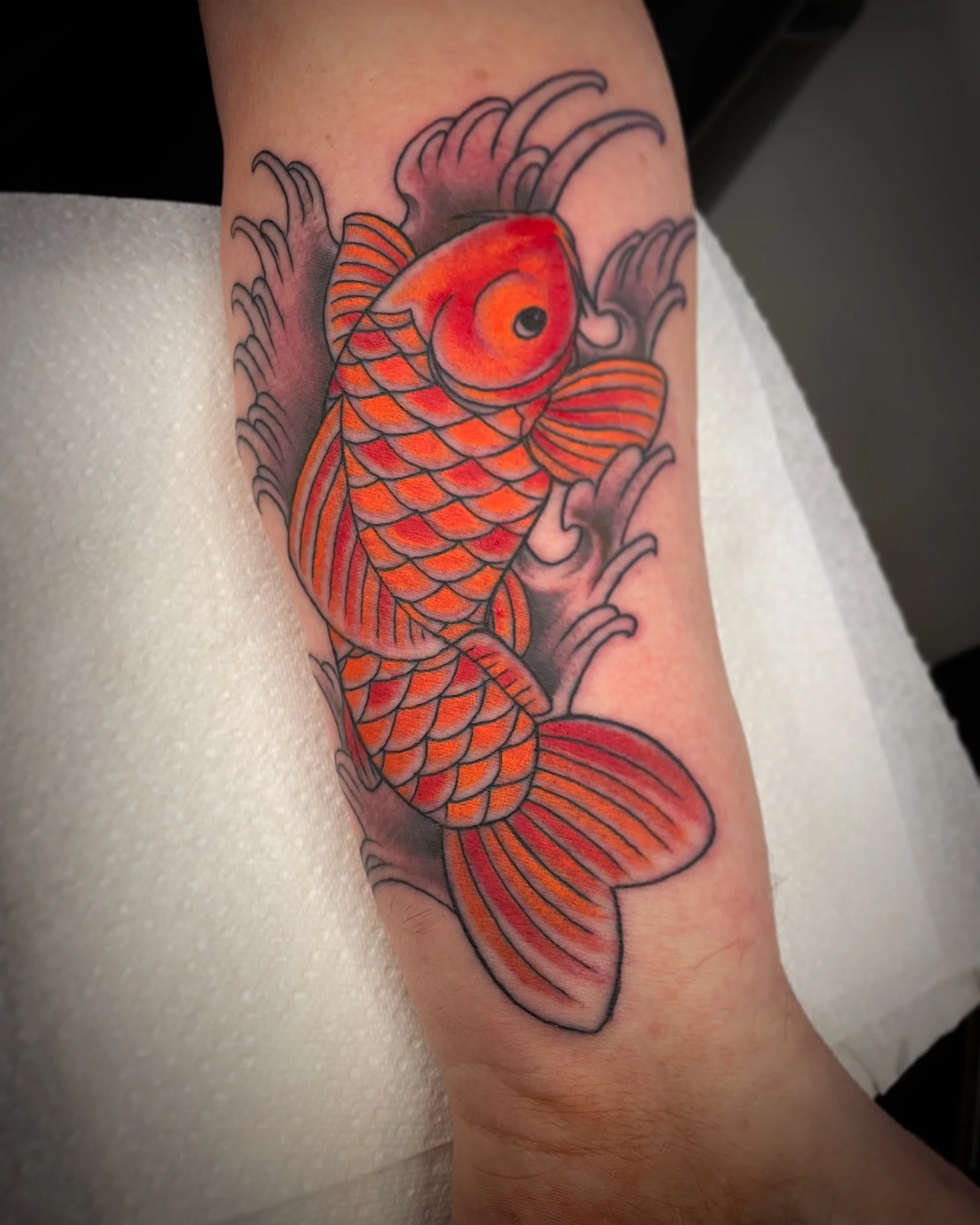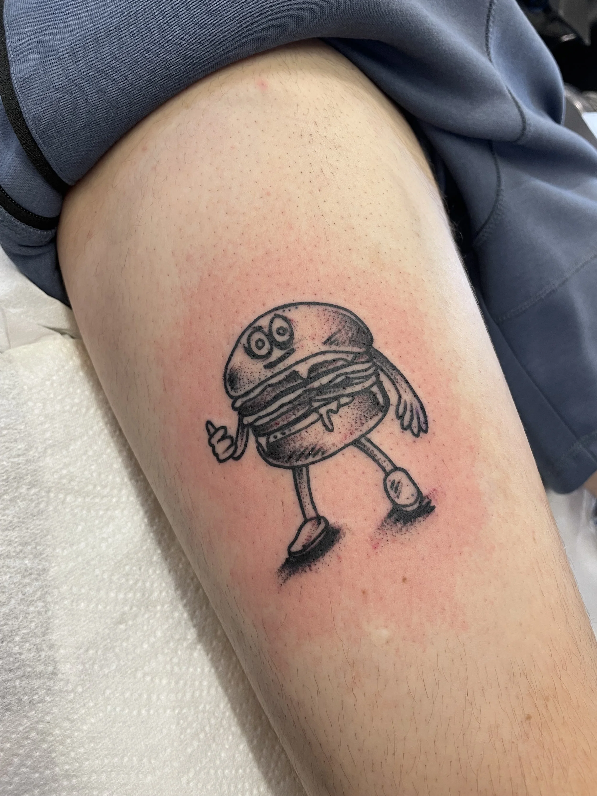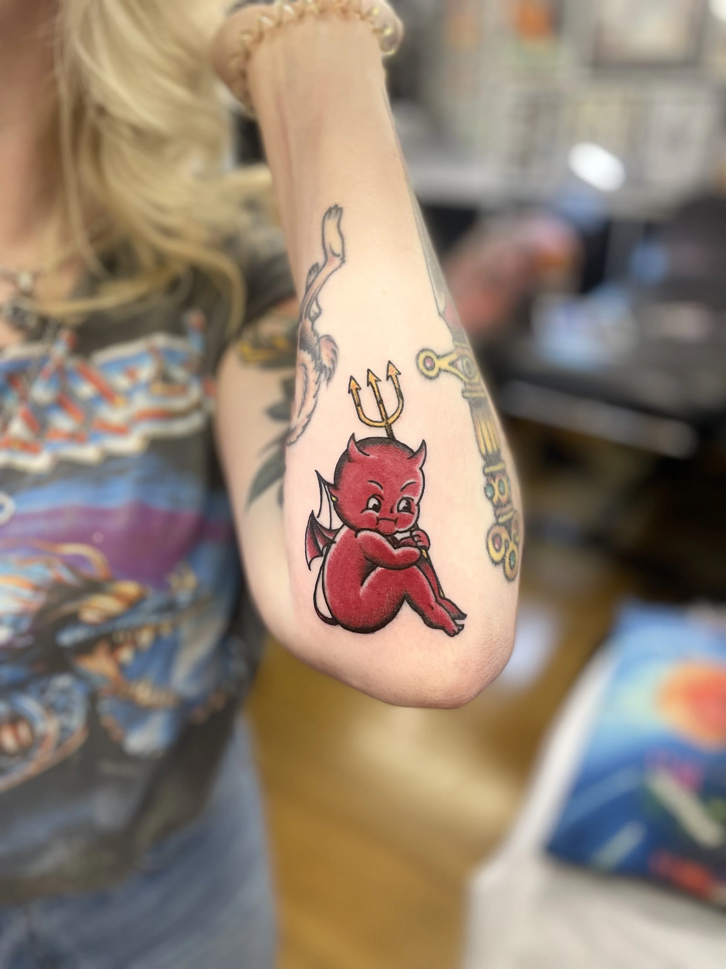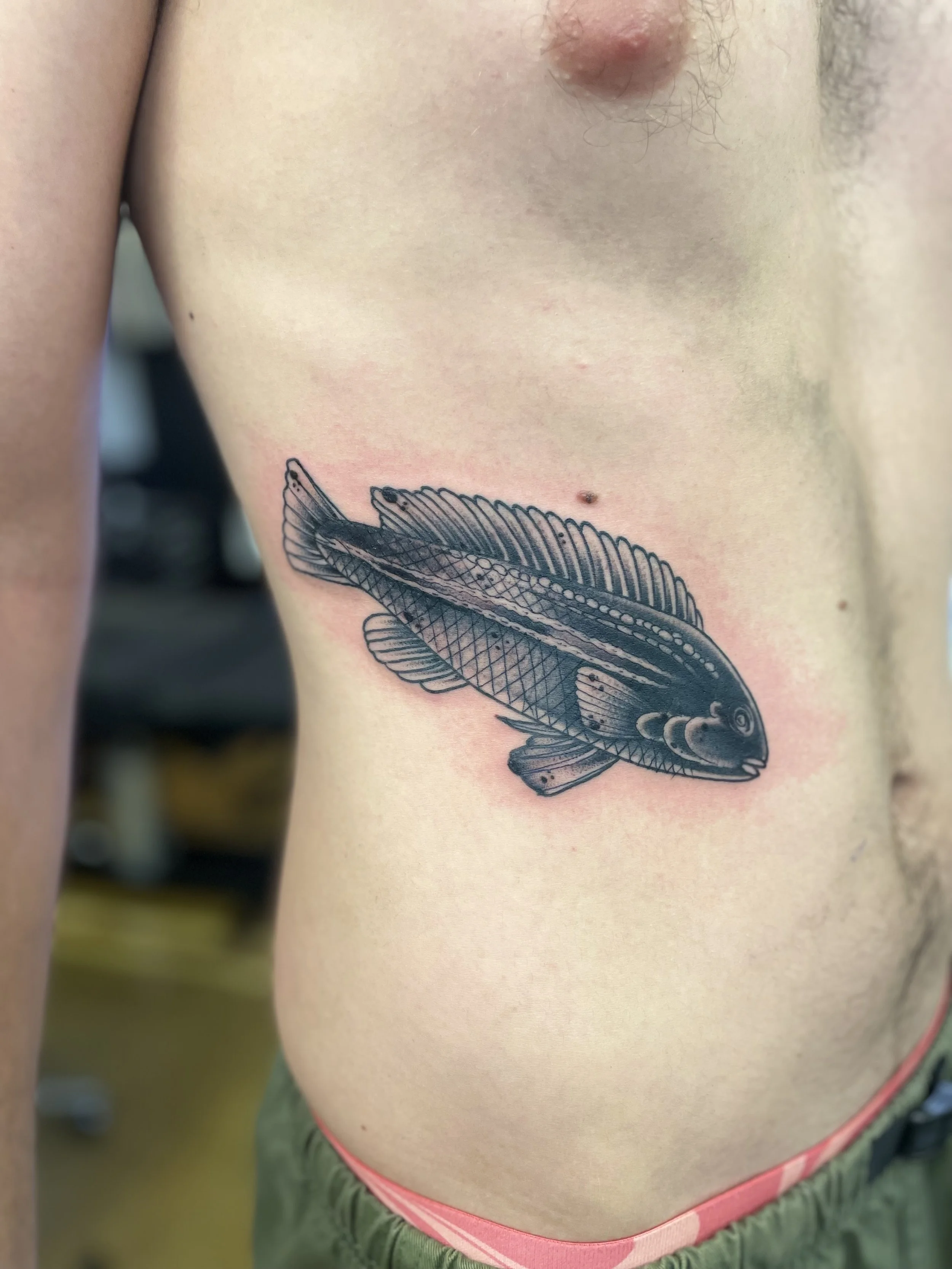 His favourite styles to tattoo are traditional and Japanese, done in his trademark bold colourful style, as well as specialising in black and grey portraits, and custom lettering. His work also takes influence from his love of wrestling, punk rock, and comic art as well as more traditional tattoo sources. Keeping up a love and respect for the traditional roots of tattooing, he enjoys painting water colour tattoo flash, and is also a skilled sign writer, hand painting lettering on anything from leather jackets to shop windows.